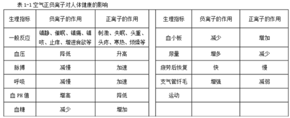 由前述的研究案例及自然现象,可明显看出离子对空气污染及人体生理反应的关系,即正离子会造成负面影响,而负离子则具有正面的影响。