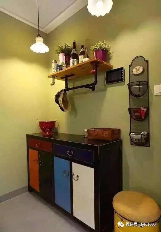 玄关中的家具,有玄关桌、边桌、衣帽架、鞋柜和穿衣镜等等。配合不同风格,这些家具或铁艺,或实木,或拼装,总之要与整体风格相匹配。如果空间允许,还可以放置一些绿色植物,或者在桌上放一些插花等作为装饰。