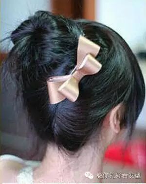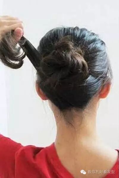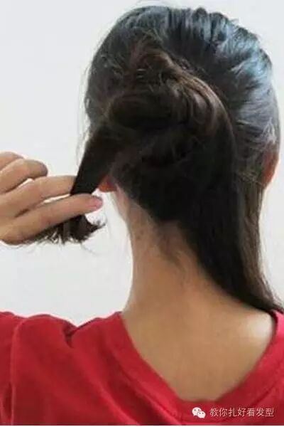 右边的头发从右向左的绕着包包头发髻一圈,发尾用发夹固定,发丝不要乱。