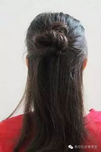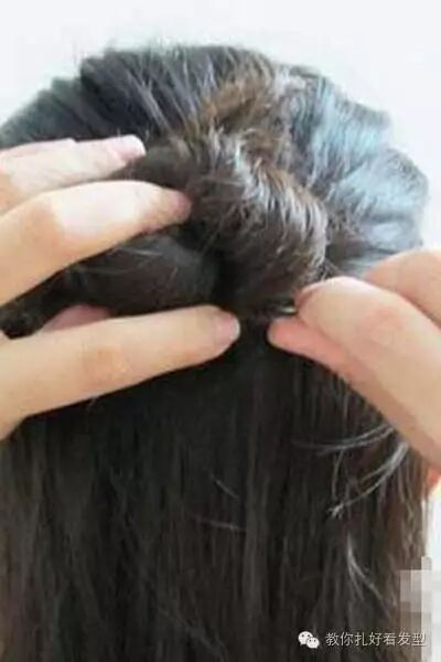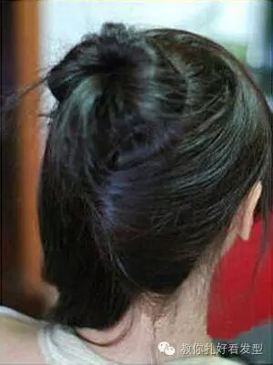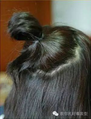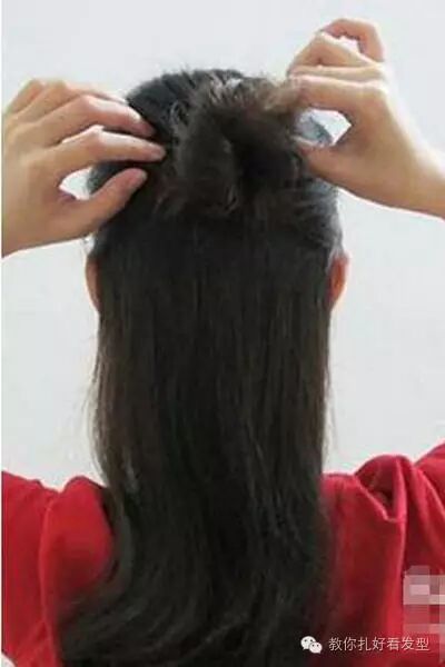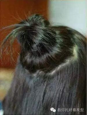 发顶的头发用尖尾梳挑出来,可以是圆形也可以不那么规则,用皮筋固定在靠上方的位置。