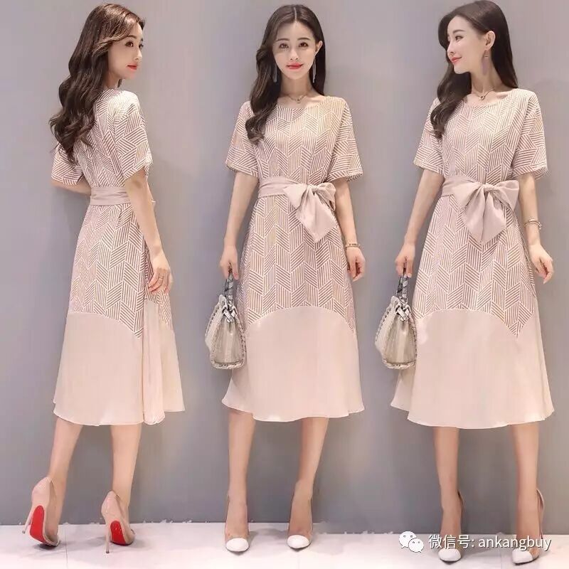 连衣裙女夏装2017新款韩版时尚修身条纹长裙显瘦短袖夏季a字裙【包邮】