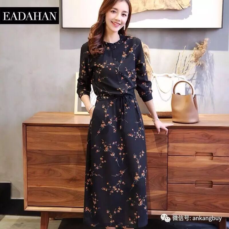 2017春季新款复古小碎花长袖连衣裙长款收腰显瘦雪纺印花春夏长裙【包邮】