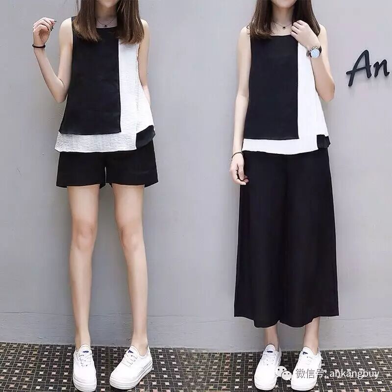 2017款时尚阔腿裤套装女夏黑白拼接气质韩版显瘦七分裤短裤两件套【包邮】