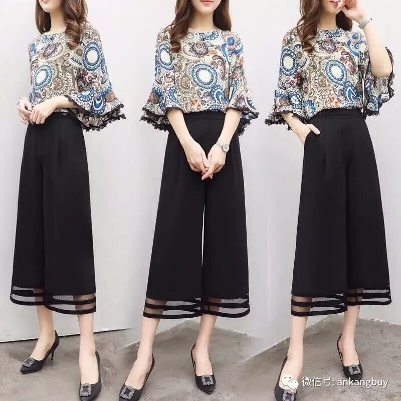 2017新款女装夏装两件套裤喇叭袖上衣阔腿裤七分裤休闲时尚套装女【包邮】