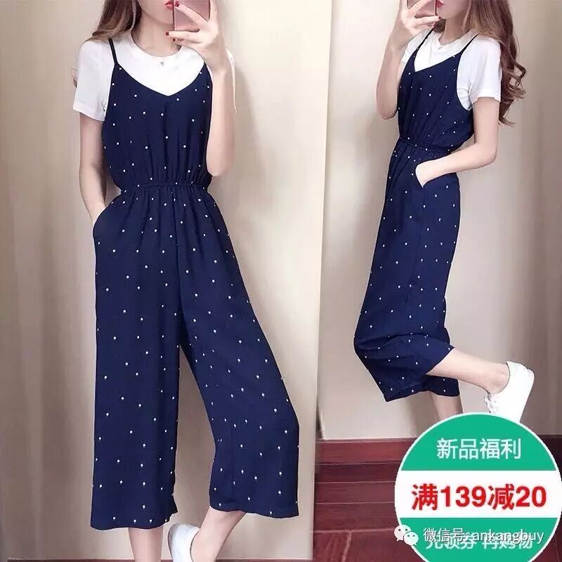 2017夏新款韩版时尚T恤连体裤韩版背带阔腿裤收腰套装两件套女潮【包邮】