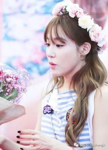 空气烫的刘海看起来很少女,也是现在女孩喜欢空气薄刘海的重要原因,这款亚麻色的长发采用大卷烫发,发丝分成均等的两个部分后做低马尾扎发造型,在发顶搭配上花环愈发浪漫清纯。