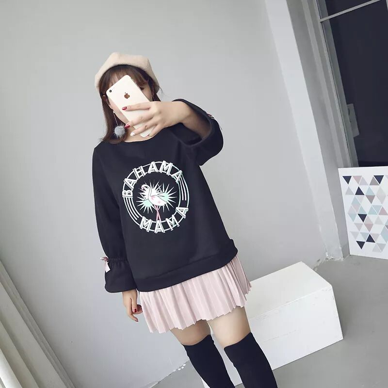 舒适的大圆领宽松的版型。 下摆是清新又俏皮的百褶拼接,上身就给人一种很活泼减龄的feel! 胸前个性的印胶,清新脱俗,给人阳光活力。 选用棉质加绒的料子上身柔软舒适,袖口做了很可爱的喇叭袖加蝴蝶结的点缀。 可以搭配打底裤呀或者小脚裤穿都很好看哒。杨杨试穿XL合适,艳楠试穿3XL合适哦!