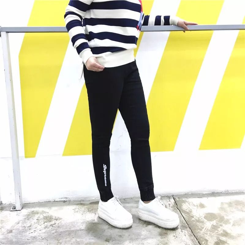 舒适的中高腰松紧腰,穿着贴身舒适,穿脱有很方便。 重工水洗的牛仔面料,柔软透气,弹力很好哦。 穿着不会有紧绷感!裤脚是亮点哦,做了刺绣字母的设计, 上身很显年轻活力,这款做了松紧裤口的设计,穿着不钻风。 大徐试穿32合适,艳楠试穿38合适哦!