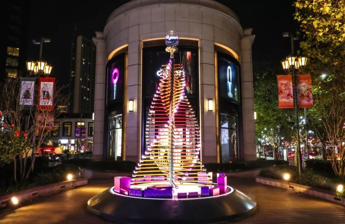 它由无绳吸尘器吸尘杆、Supersonic 吹风机和组成,向双螺旋这一象征 DNA 的分子生物学结构致敬。戴森圣诞树高达 10 米,矗立于 2017 年 9 月在太古汇开业的戴森首家官方体验店外。