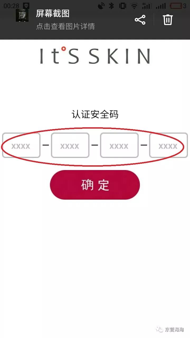 在图中红圈所示部分输入防伪标示上的安全码(security code) 然后点击确认。