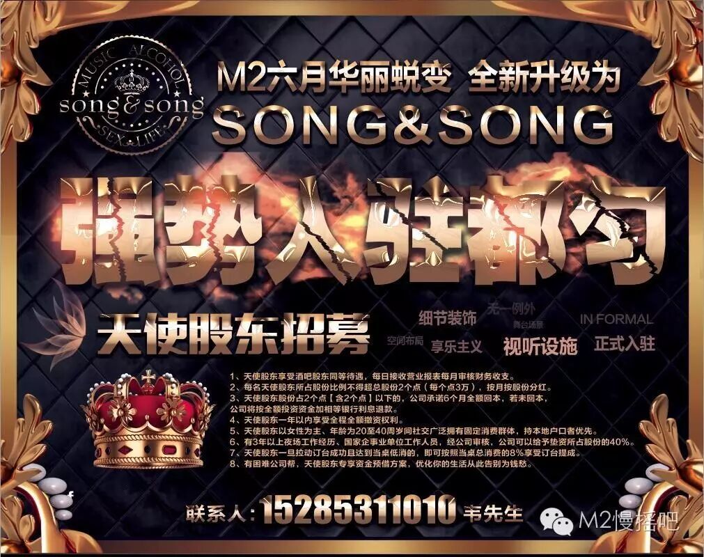 上上Song&song娱乐于2007年9月成立,公司主要经营娱乐、餐饮、房地产、电影院、、影视、音响公司等。上上娱乐旗下的上上酒吧是一家集演绎、演奏、演唱于一体的专业时尚娱乐空间,酒吧拥有庞大而健全的人力资源部、音乐部、市场营销部等,短短几年时间分别在西安、武汉、泉州、郑州、柳州、济南、洛阳、海口、焦作、南阳、南宁、邢台、安阳等地迅速的占领了市场并在当地获得良好的口碑,北京、厦门、杭州、深圳、上海、成都等地也正在紧锣密鼓的筹划之中。