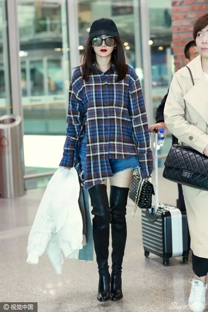 再比如穿裤子不开心的杨幂,格子衫+短裤+过膝长靴,红唇配皮靴经典套路百玩不厌。