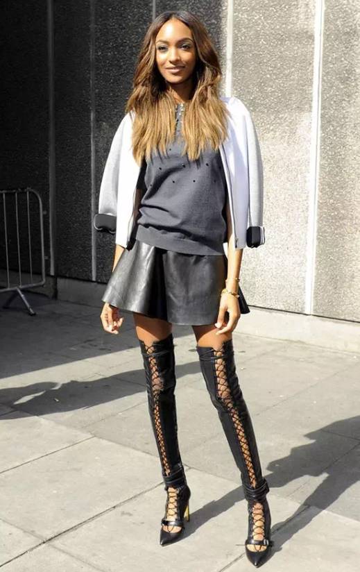 上衣就到腹部,长靴到膝盖上就“戛然而止”,大腿处任何细微瑕疵都会在这种搭配中被放大。