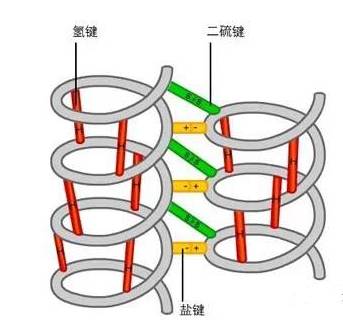 头发放大之后就像很多紧密链接的链条,而这些链条之间也互相拧在一起,形成了头发的外形。而在这些链条之间会有很多类似“桥”的东西来链接,其中一种是氢键,另一位是硫键。氢键是很容易破坏和搭建的,而硫键则不容易。