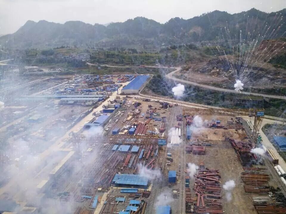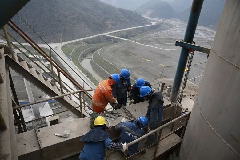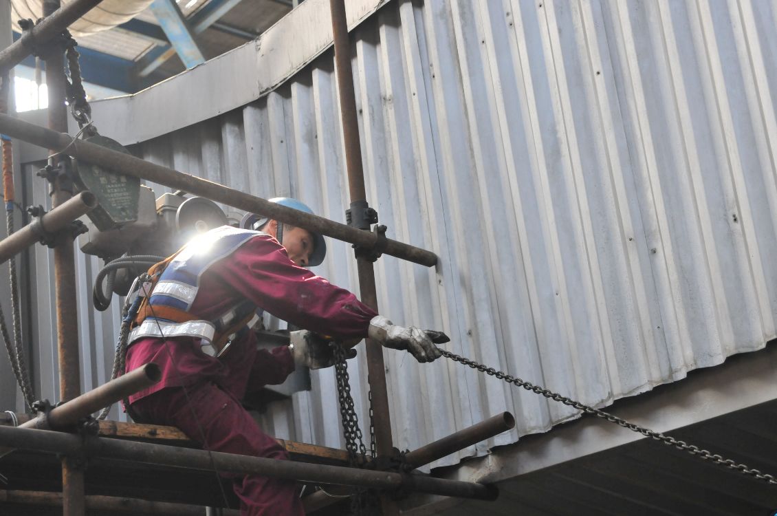 这是绥阳公司水泥分厂预热器128米C1平台,高空中,几名工人专注地进行入窑斜槽检修,对这高空中的风景已熟若无睹。这张照片拍于2016年2月,空地处的铁合金场平与如今大不相同,一座座厂房已拔地而起,齐唱着绥阳公司项目建设的快歌。