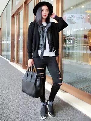 针织开衫搭配皮衣的惊喜组合,带有硬朗洒脱感。下身选择相同色系的破洞牛仔裤,十分抢眼。塑造出前卫又炫酷的男友风。