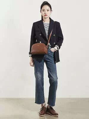 双排扣西装搭配阔腿牛仔裤,个性的男友范穿搭彰显帅气气质。足部选择复古单鞋和斜挎小包,展现个性的复古造型感觉。