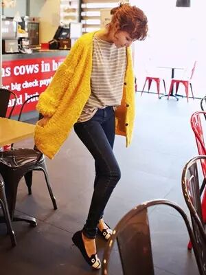 糖果色的针织开衫,靓丽青春感觉依旧,加入条纹T和牛仔裤休闲穿搭更有型。加入平底单鞋,舒适穿着就这么美貌!