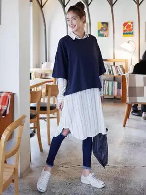 休闲有淑女感觉的中袖T内搭长款蕾丝裙,叠穿穿搭展现少女的美丽,韩国女生示范轻熟的温柔穿着。