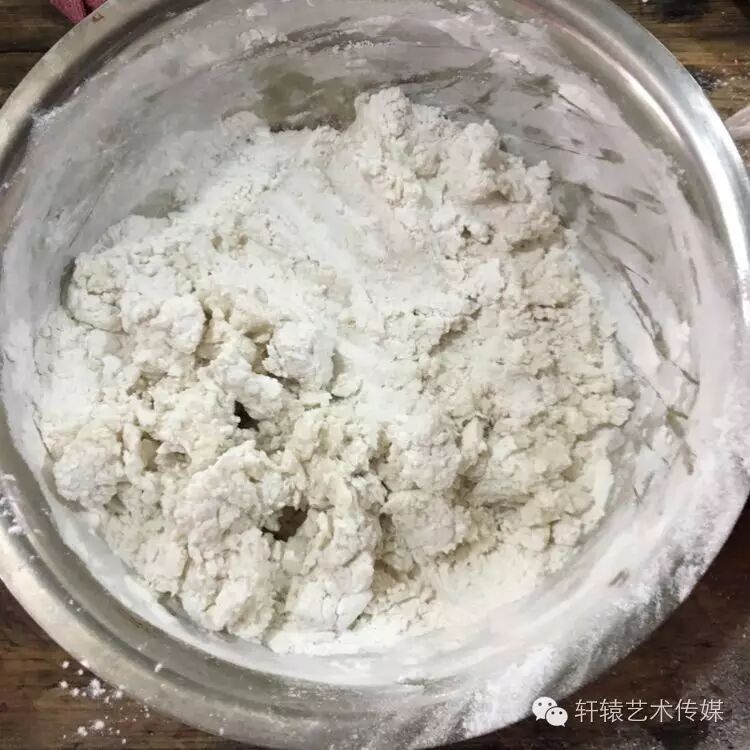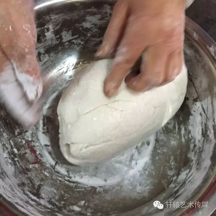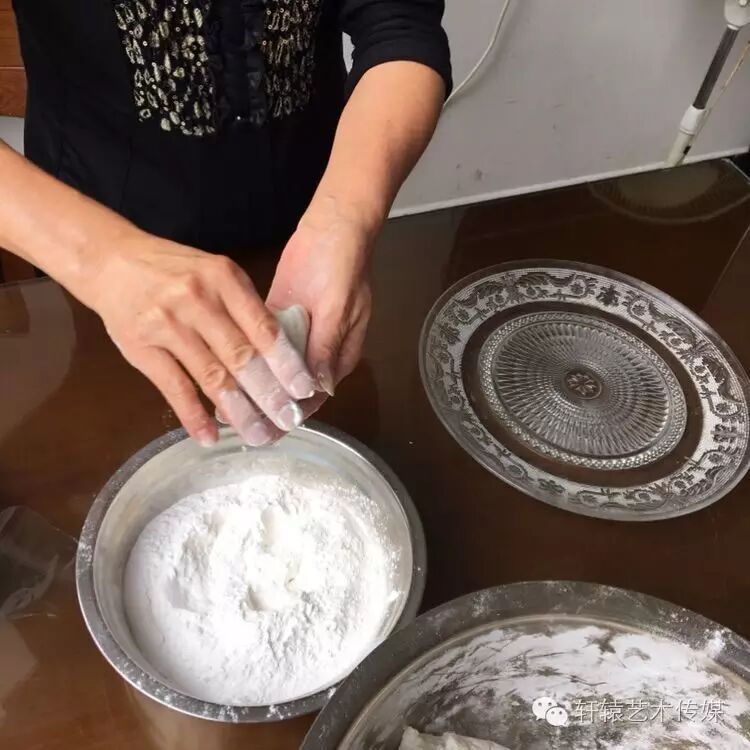 另外准备一碗粉,作为粉面使用。手上先沾点粉,再取一小搓揉好的团双手捏薄皮,这样手就不会被黏住了。这个技术含量很高,高手新手,从捏的皮上,一眼就能分辩出来。