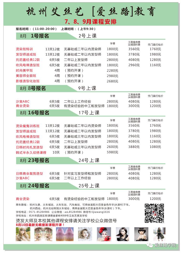 学习内容:深度三原色,多段一步到位,超强质感染发,复方混合调色,每一个都特别,玄色,灰色,潮色调灰色,高明度盖白发,染膏一步改蜡,红改亚麻,改金,改灰,改所有色,黑油改色,店里所有疑难杂症解决,渐变,过度色,色彩学等等.....更有科学的热烫排列方式,摆杠与花型的关系,层次与花型的关系等等,全新的热烫概念,让你烫完自然干,不用刻意打理,真正的免费打理烫发!你要学的这里应有尽有,欢迎你的到来!