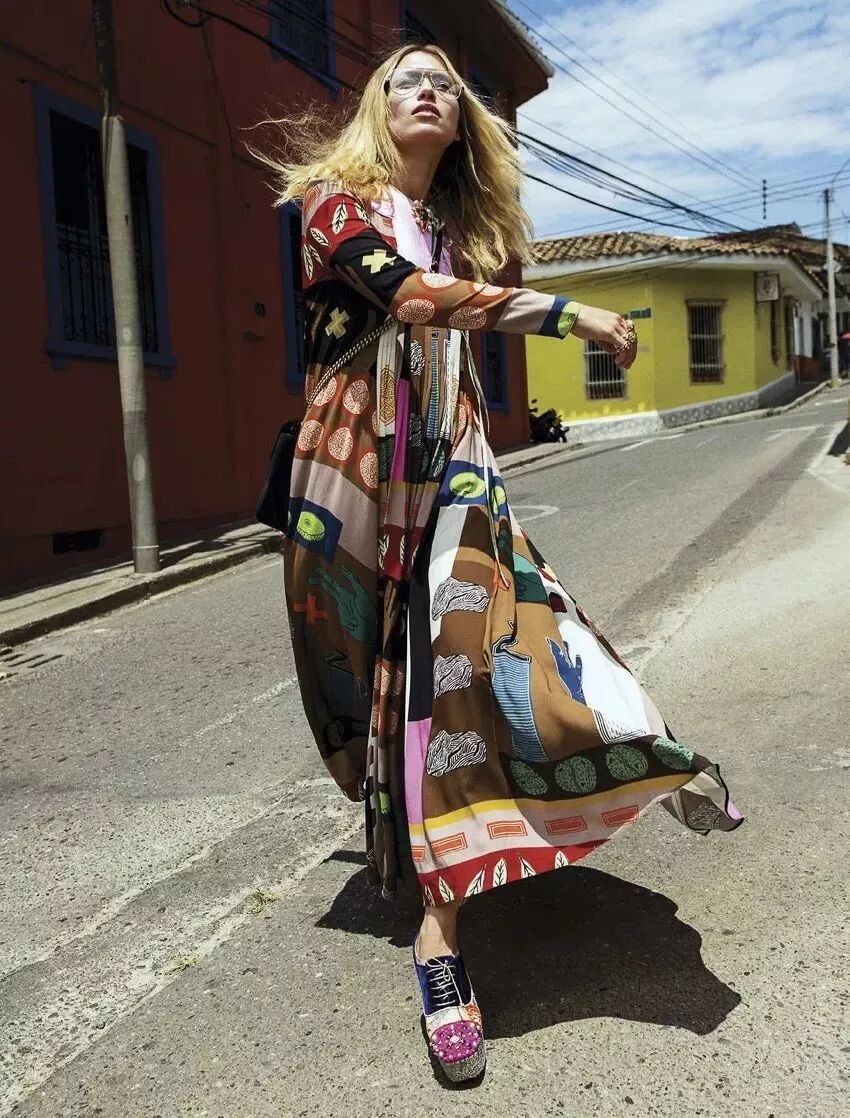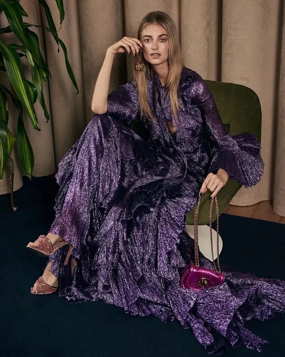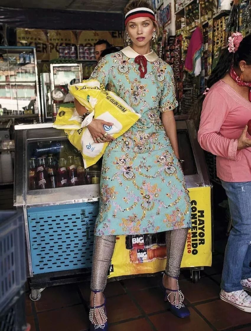 繁杂系列影响杂志造型。包罗万象的配饰流露出考究之感,跨文化服装尽显俏皮。宝石搭扣彰显皇家复古格调,多种装饰细节与面料拼接彰显现代极繁风格。