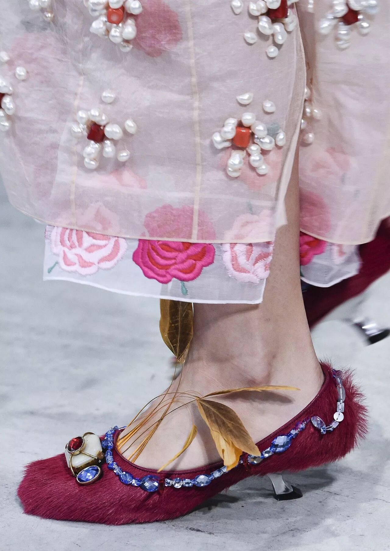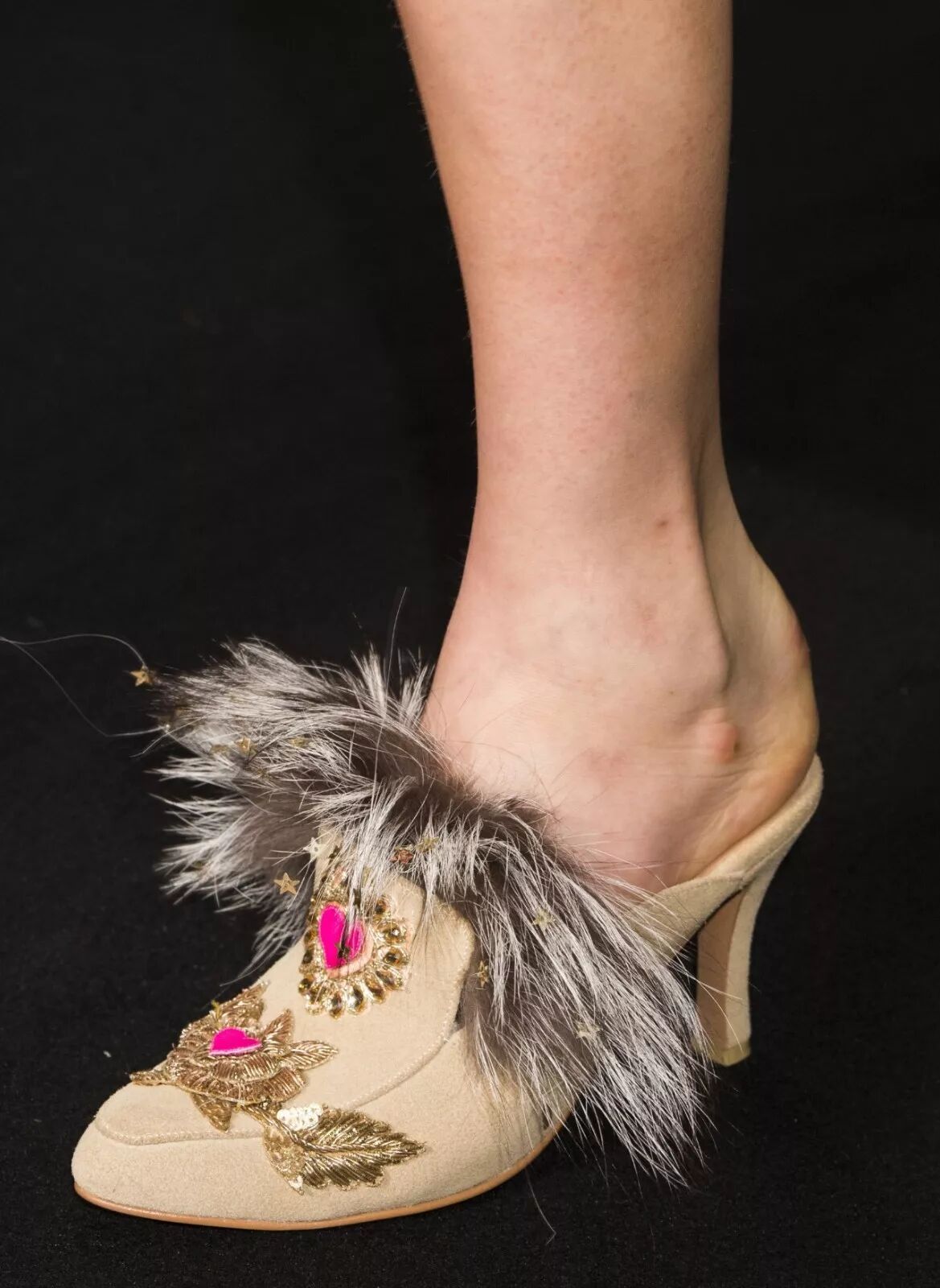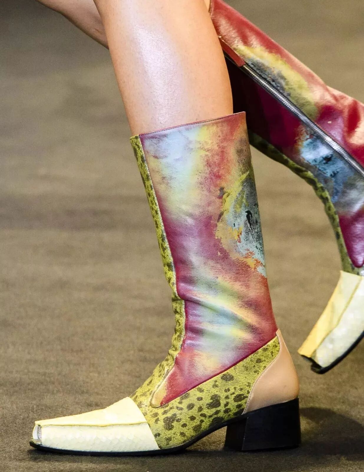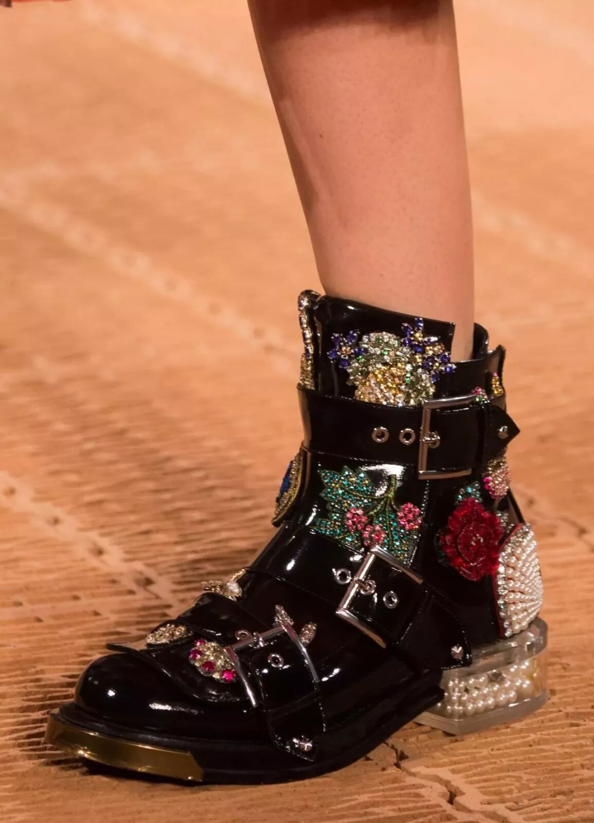 设计师们从建筑和艺术角度探索年代感细节,从靴子到拖鞋,闪亮细节在各种鞋型上出现,俏皮华丽更新经典风格。