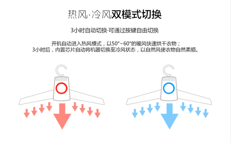 干衣机开机后自动进入热风模式,以50°-60°的暖风快速烘干衣物,3小时后,内置芯片自动将机器切换至冷风状态,以自然风使衣物自然柔顺。最重要的是衣架采用的是全行业内最安全可靠的PTC陶瓷发热技术,热效率远高于发热丝等普通发热技术,散热比较温和,不伤害衣物;耐高温阻燃材料、内置微电脑保护程序,三小时自动切换冷风系统、防过热温控保护系统三重保护于一体,安全更可靠。