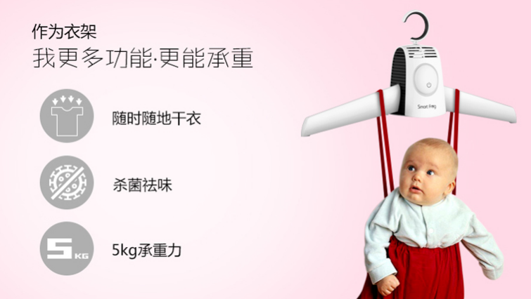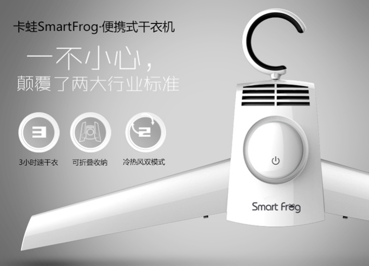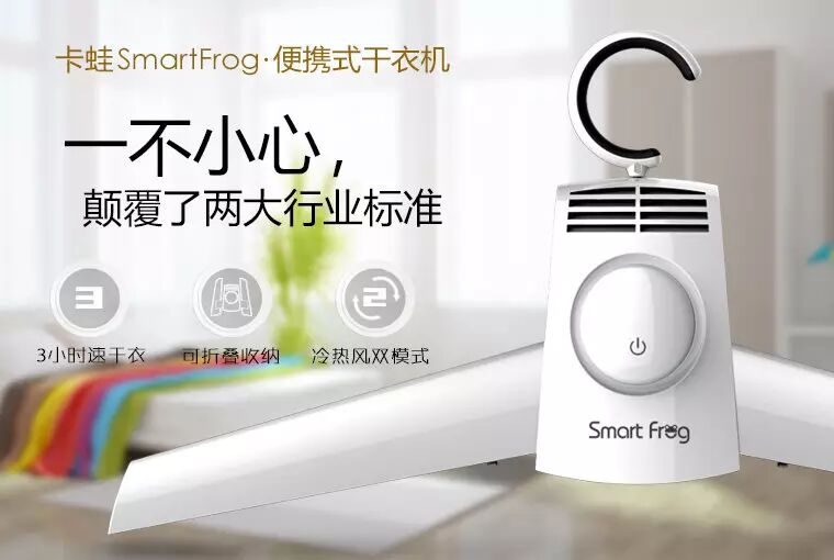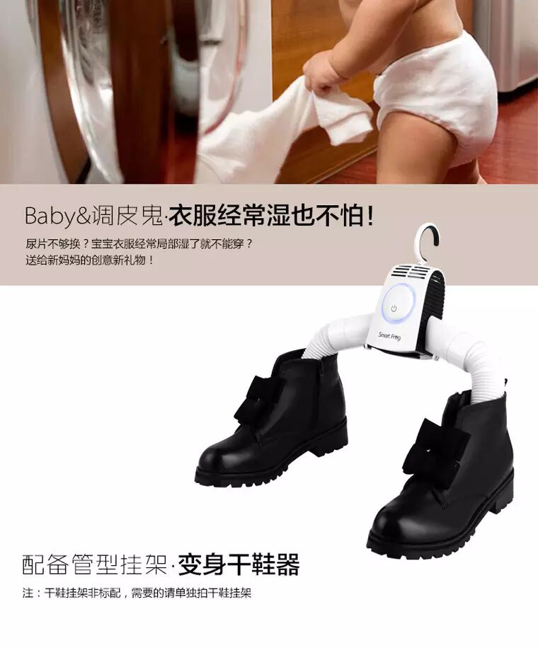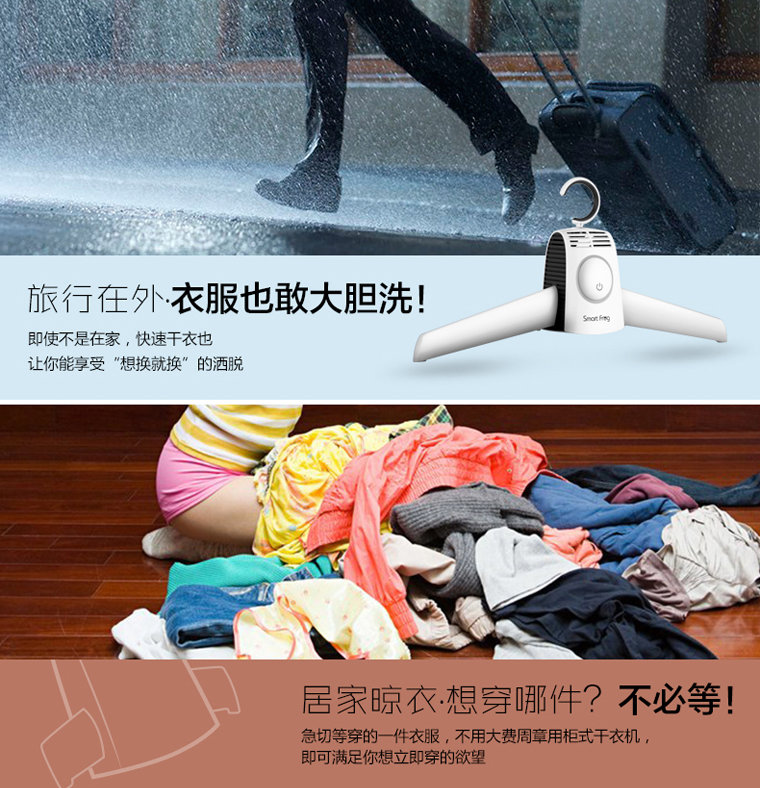 梅雨季节来临,潮湿的空气笼罩整个城市,甩干的衣服晒了比不晒还湿!尿布不够用,宝贝的衣服经常局部潮湿,穿吧对宝宝有伤害,不穿又已经没有换洗的衣服!出差在外,衣服不够,洗吧,不干;不洗,太脏!肿么办?!——卡蛙便携式干衣机马上帮你解决~