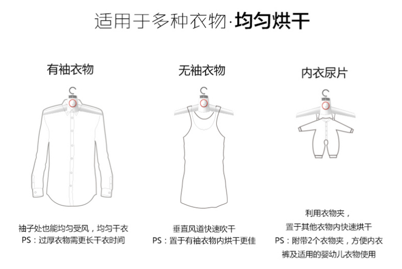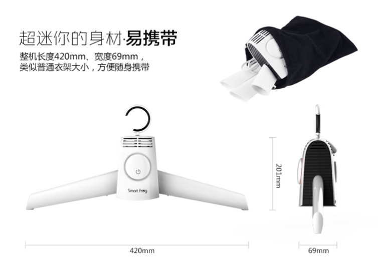 干衣机整机长度420mm、宽度69mm,类似于普通衣架大小。其中两根风管可以方便的拆卸,搭配附赠的收纳袋,可折叠式挂钩内含硅胶防滑圈,使用方便,收纳也方便!