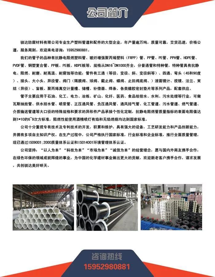 我公司的主要产品有pp管|frpp管|聚丙烯管|增强聚丙烯管|pp管材|frpp管材|大口径pp管材、板材、管件、阀门等,可广泛用于城镇给排水工程、农田灌溉、石油化工、化纤、染料、农药、医药、食品、轻工、冶金、污水处理等领域。由于该产品具有强度高,pph管厂家,耐腐蚀性好,寿命长,比重轻,施工方便、快捷等优点,身受广大用户的好评。
