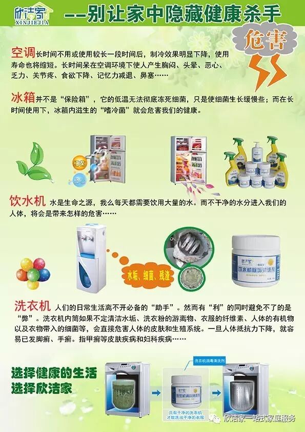 那么,家电应如何进行清洗?清洗后又有那些好处呢?今天,欣洁家小编就以空调、洗衣机和饮水机为例,给大家普及一下家电清洗的知识。