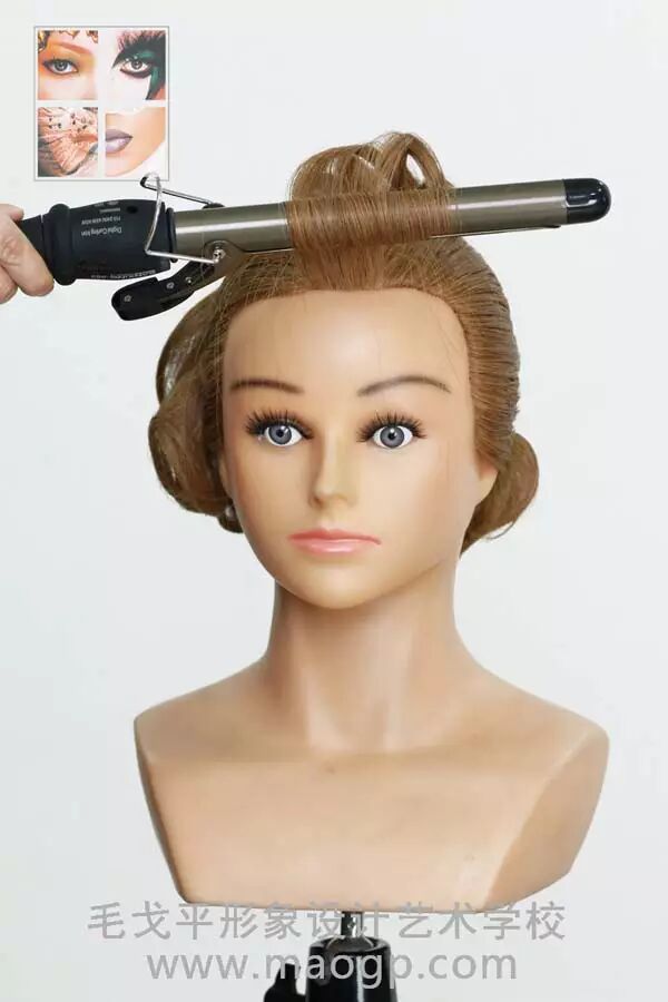 7、前额发片用卷发棒由外向里卷出弧度,在发根喷发胶,用手或尖尾梳推出波纹,使头发形成自然的弧度,波纹刘海需遮盖发际线,对脸型形成修饰。刘海发尾与后区盘发自然衔接,用夹子固定,注意整体轮廓的流畅饱满。