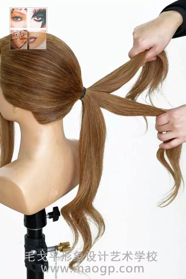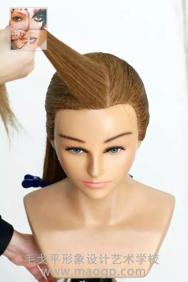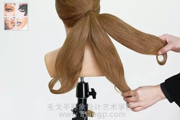 2、前额后侧发区分出大约宽3公分的发片作刘海,后侧头发用皮筋扎低马尾。梳头时一定要注意把头发梳顺哦,否则直接影响后面的造型效果。