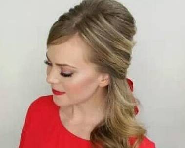 第一步:带有黄色染发设计的长发只是在发尾做漂亮的卷发弧度,带有倾斜直发刘海的长发梳理整洁,发顶分离出一束发丝向后梳理出蓬松的造型。