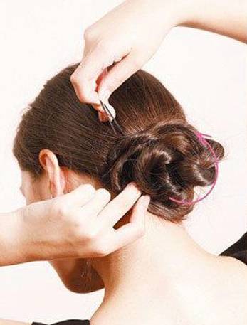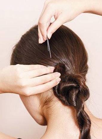 step5:将其中的一股扭转好的头发盘起来用发夹固定。
