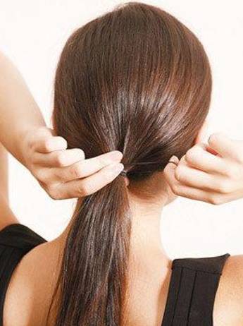 step2:侧分的长直发在脑后用细皮筋扎为低马尾。