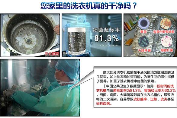 答:洗衣机粗看起来是比较干净,但洗衣机内桶的外面还套有一个桶,洗衣水就在这两层中间进进出出,日久天长便藏污纳垢。这些污垢附着在内桶的外壁(也就是我们通常所说的洗衣槽),我们是看不见的。由于洗衣机内部非常潮湿,这些污垢将在洗衣机内部发酵,并滋生大量细菌,洗衣时会污染衣物并带给人体,从而影响我们的身体健康。